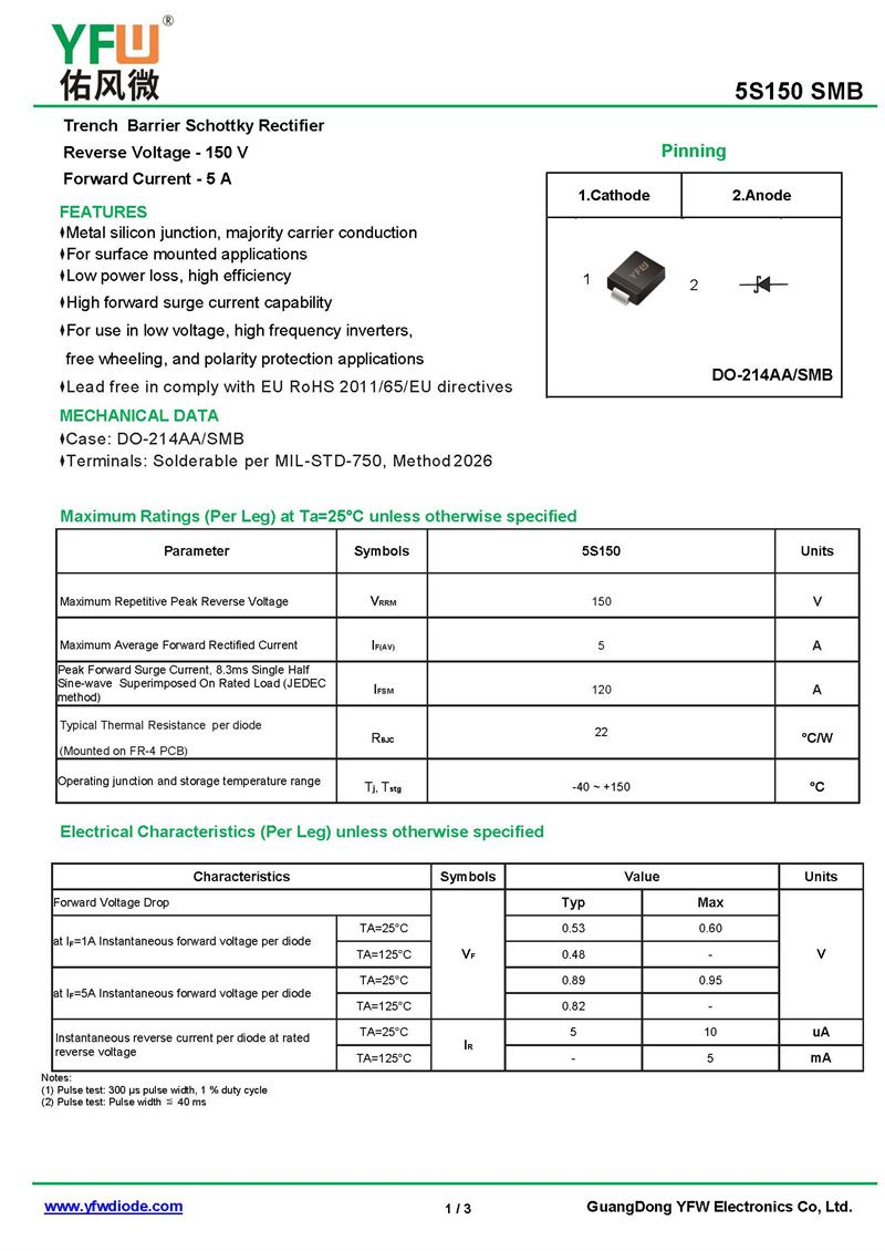 肖特基二極管5S150 規格書_價格_PDF手冊-廣東佑風微原廠5S150 SMB_(YFW佑風微)品牌